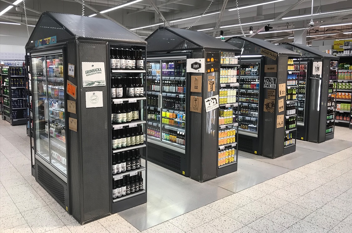 Low-height impulse coolers and freezers are ideal for fast-moving grocery products on the convenience store floor area.